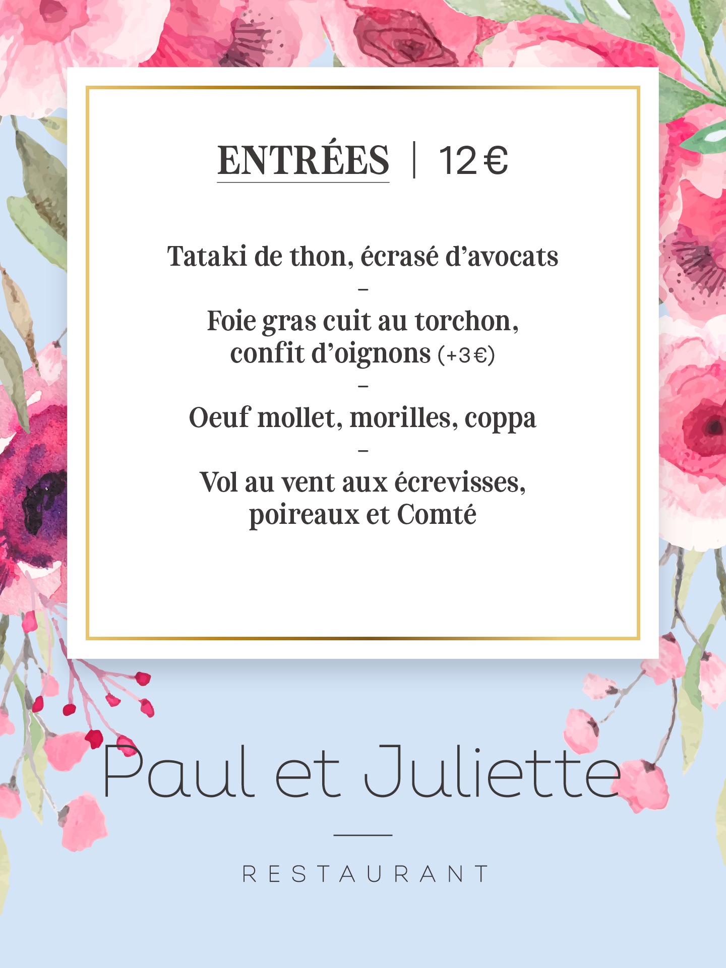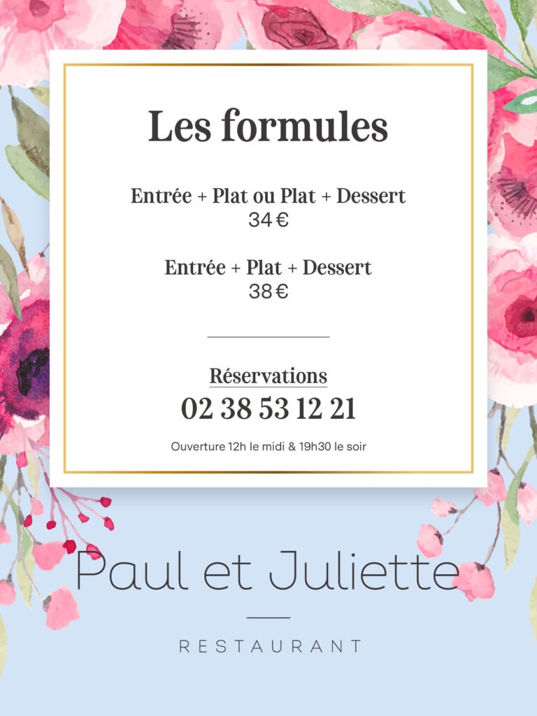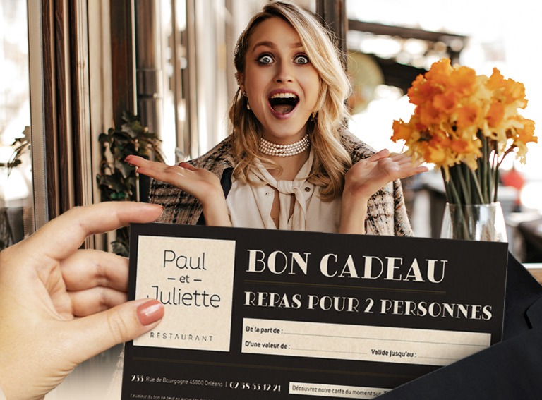 Pour la fête des mères ou tout autre occasion offrez un bon-cadeau Paul & Juliette ! Valable pour 2 personnes, il fera le bonheur de ses destinataires qui choisiront eux-mêmes leur date et leur formule (déjeuner ou dîner).